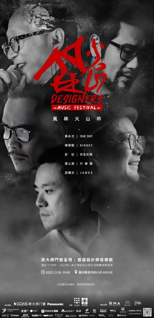 设计师音乐节是中国首个设计师创办的音乐文化IP。由知名设计师彭征、黄永才、梁曦文、陈德坚、林森、万士源先生等联合发起、欧大师门窗作为总冠名的设计师音乐盛典,于2025年12月8日在广州声音共和Live House举办,以“风林火山吟”为主题,共五支乐队参与演出。