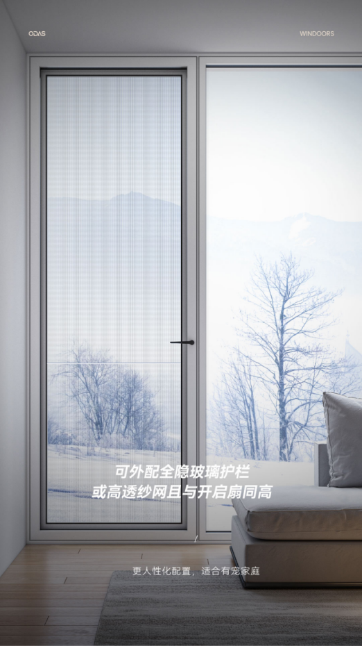 可外配全隐玻璃护栏或高透纱网且与开启扇同高